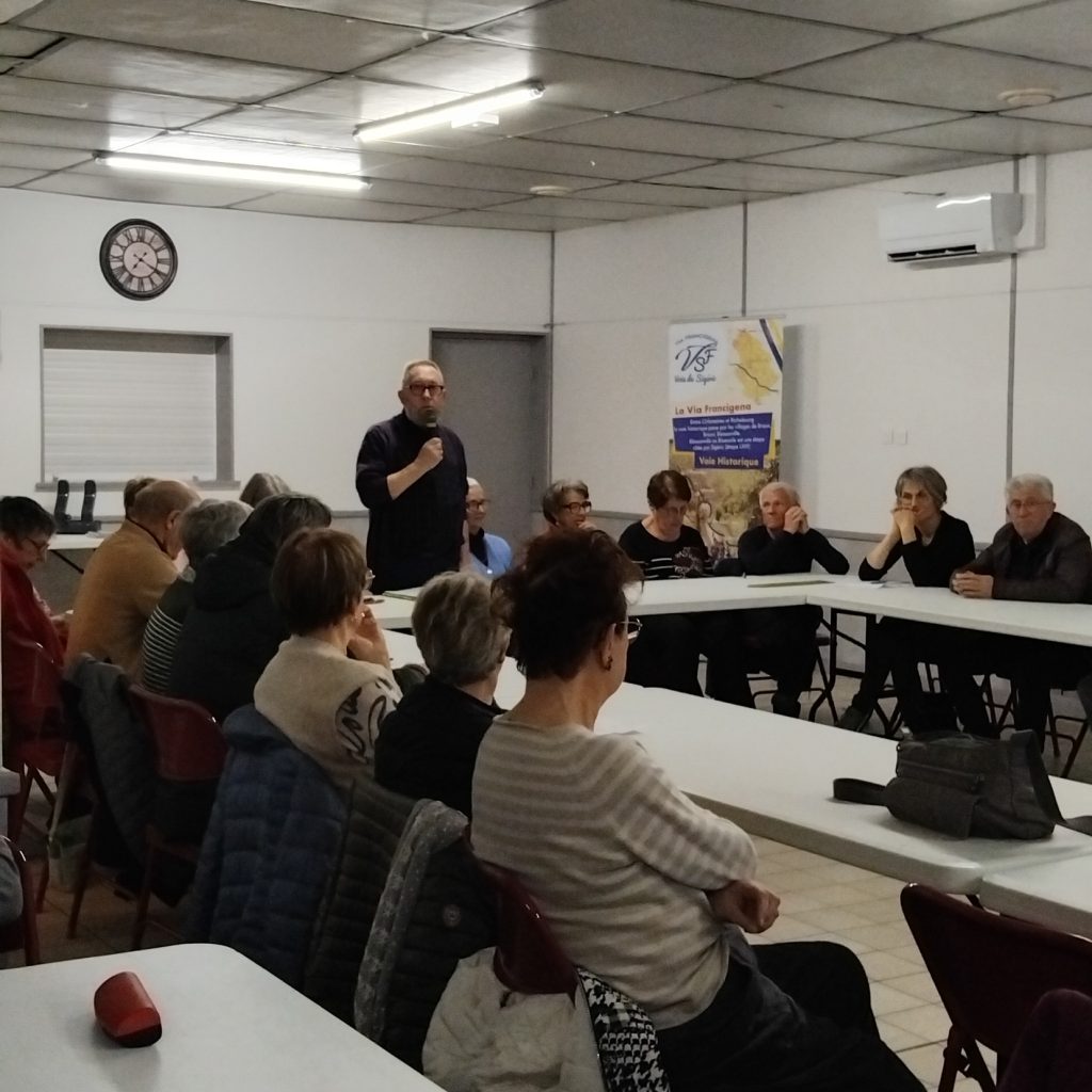 Cette assemblée générale était précédée d’une réunion à 18 h avec les hébergeurs du département (28 personnes). C’est à dire d’Outre Aube à Coublanc, 130 km. 11 personnes ont pu témoigner de leur expérience de l’année 2025, le nombre de pèlerins recueillis, le service proposé et éventuellement les problèmes rencontrés mais également l’aide que peut leur apporter VFVS. Tous ces accueils sont répertoriés dans un livret édité par la Fédération Française de la Via Francigena (FFVF) et à la disposition des pèlerins.